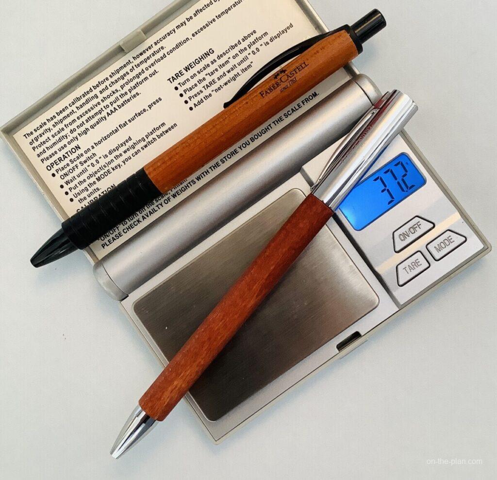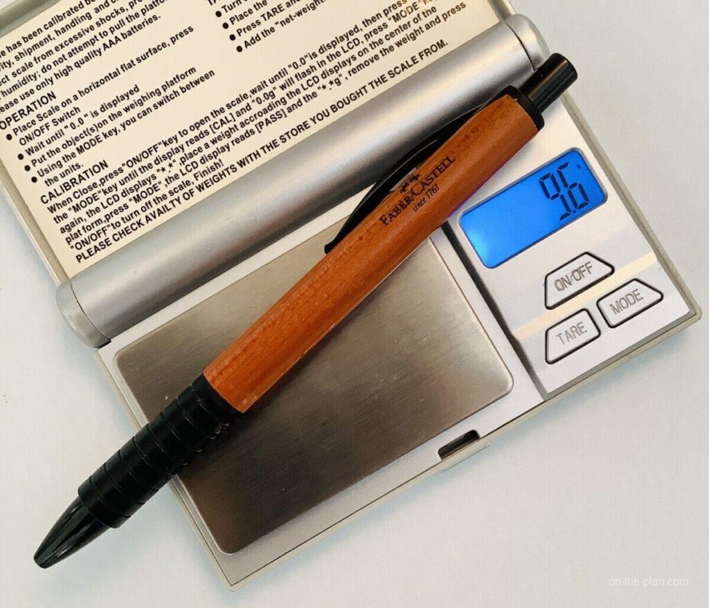 アンビションはファーバーカステルの木軸ベーシックボールペン10グラムと比べても相当に重い。この重さを利用して筆記すると、「書いている感」がもりもり来ます。好みは分かれます。